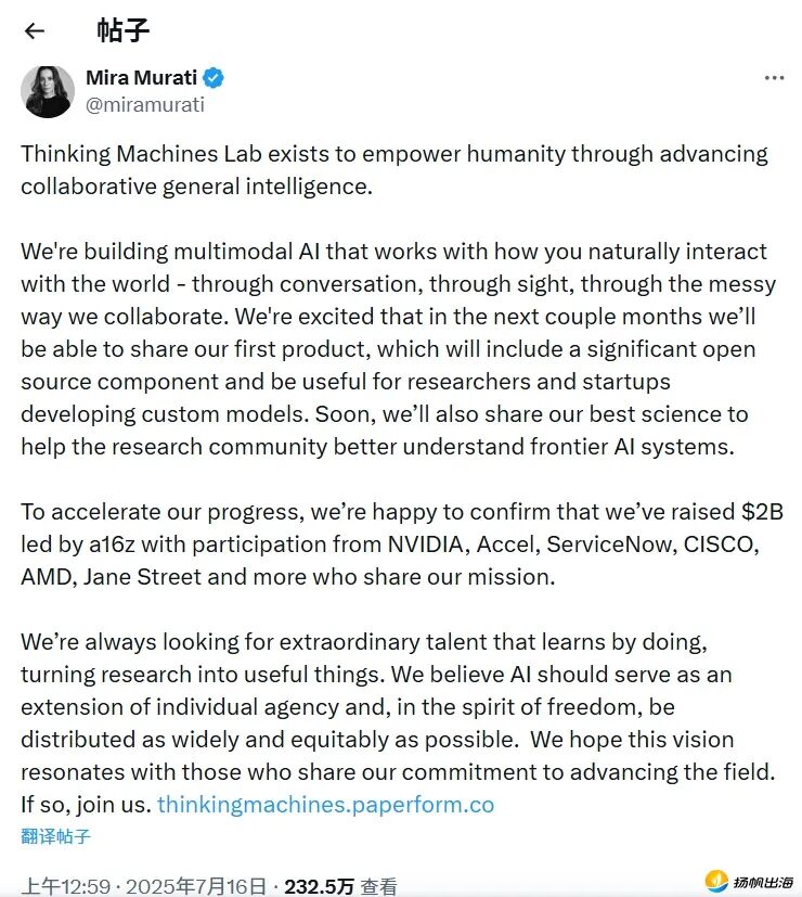 2025年7月,Mira Murati在X发帖称,TML已完成由a16z领投的20亿美元的种子轮融资,公司估值达到约120亿美元。参与本轮投资的机构还包括Nvidia、Accel、Cisco和AMD等。