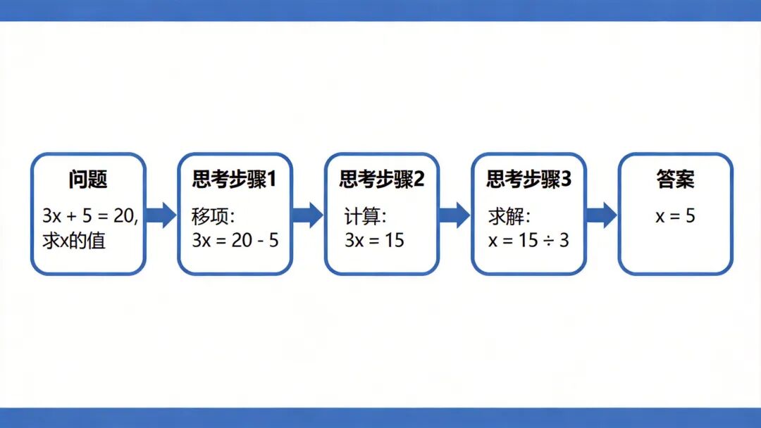 CoT的核心思想是:让模型在给出最终答案之前,先生成中间推理步骤。这类似于人类解决复杂问题时的”草稿纸”思维——我们不会直接写出答案,而是先一步步推导。