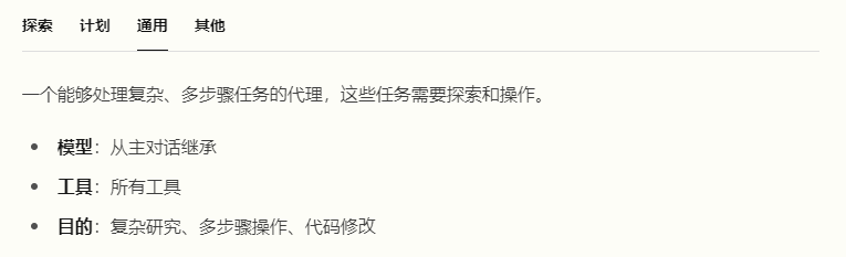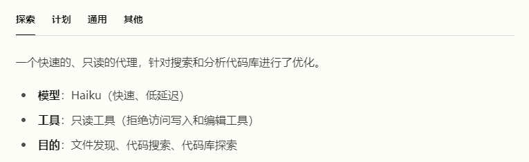 抛开最后「其他」里几个不谈,探索(Explore)、计划(Plan)、通用(General-purpose)这几个agent特点显著,它们面向的场景较为宽泛,都是以一套机制作为支撑,来保障生成效果。