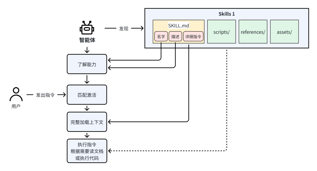 这背后体现着Skills一个很重要的设计理念:渐进式加载(Progressive Loading)。即:如果有多个Skills,智能体在启动时,会先读取每个Skill的名字和描述,了解它们的能力。等用户下达任务后,由系统判断和某个Skill匹配,才按需加载它的完整指令、脚本和参考资料。这样既节省上下文空间,又能在真正需要时提供完整能力。