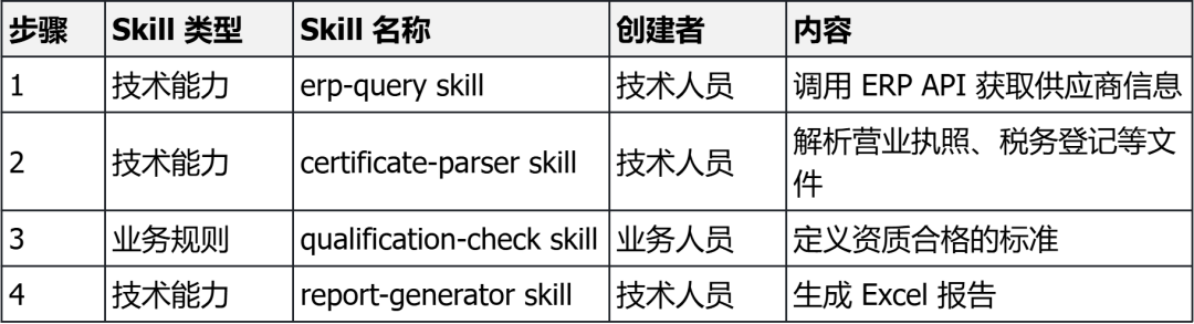 如果只让业务人员判断,他们会认为创建个合同审核skill很简单,就是把条款读一读,让模型给个结论。但一拆就知道,这背后需要解析Word文档、识别条款语义,甚至还要调用法务知识库,这些全是工程活。