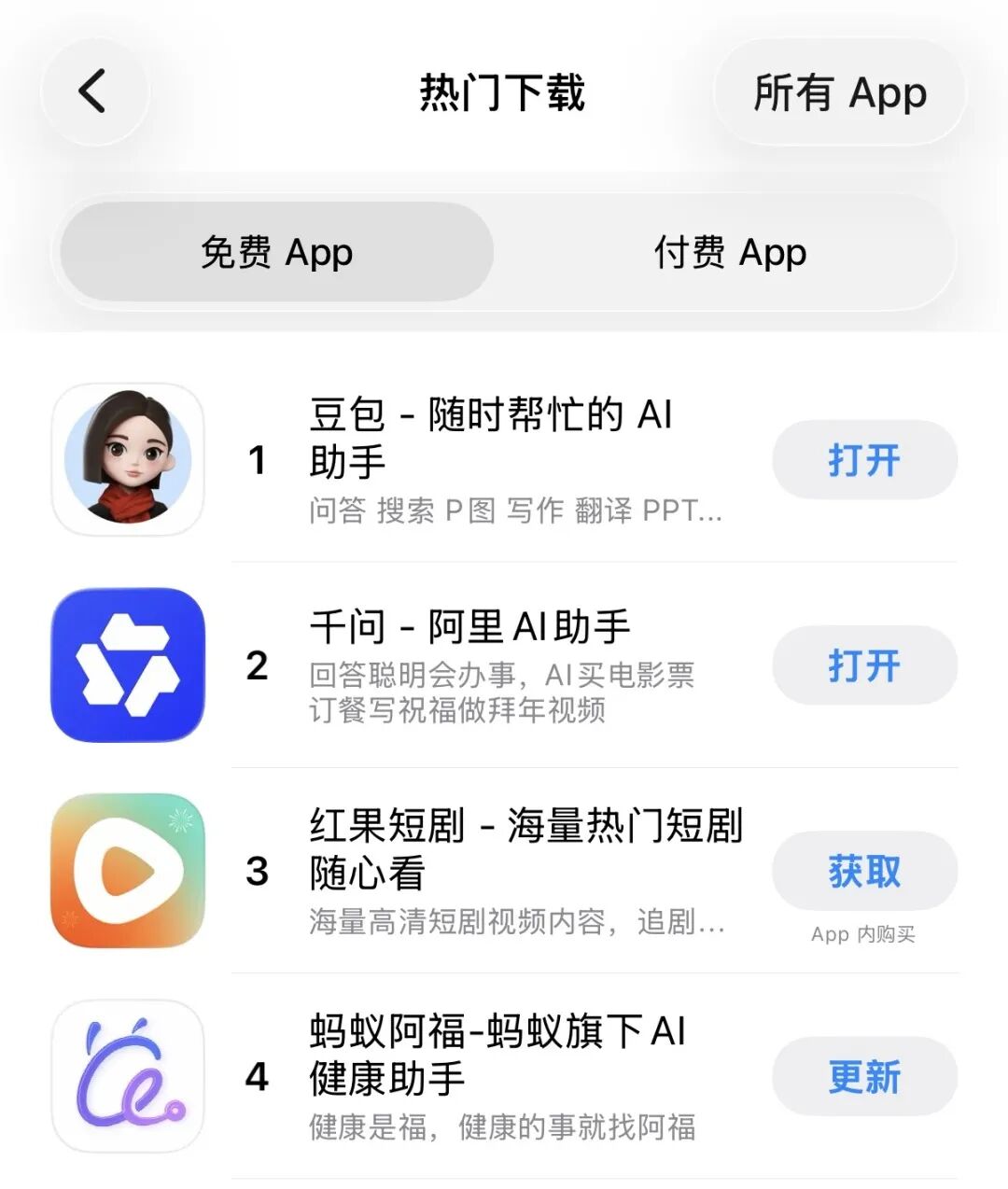 例外之一是垂类AI助手蚂蚁阿福。通过「健康福」活动、亮相央视马年春晚,以及返乡青年教家人用阿福的热潮,阿福App下载量持续飙升,连续多天登顶苹果App Store应用下载总榜第一。