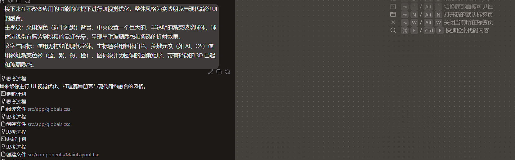 - 创建项目后,将立即启动需求分析,并规划开发流程和步骤,逐步生成应用的前后端代码。