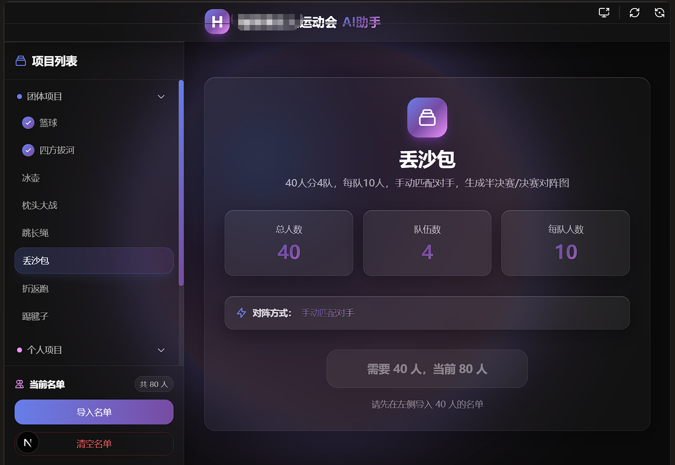 初始需求往往只有几句话:“帮我做个运动会分队系统,有篮球、拔河……分队规则……”。如果不加追问,直接开工,大概率会返工。我通过与需求方(其实就是同事)反复沟通,最终整理出精确的规则文档。下面是几个关键问题的澄清过程:
