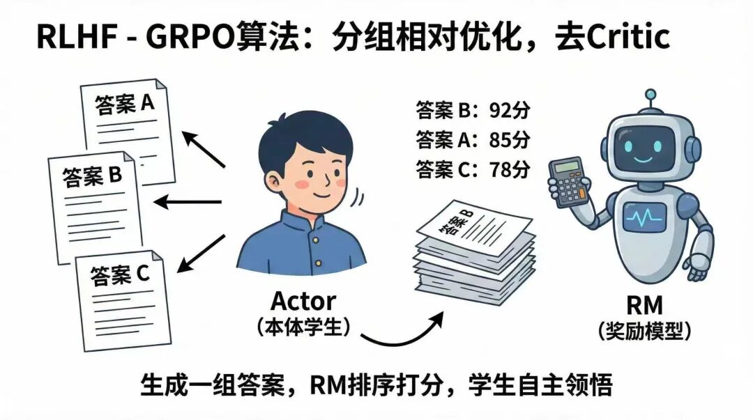 而GRPO做了一个聪明的取舍:继续保留RM这位针对结果打分的机器人老师,但砍掉了Critic这位针对过程打分的老师。