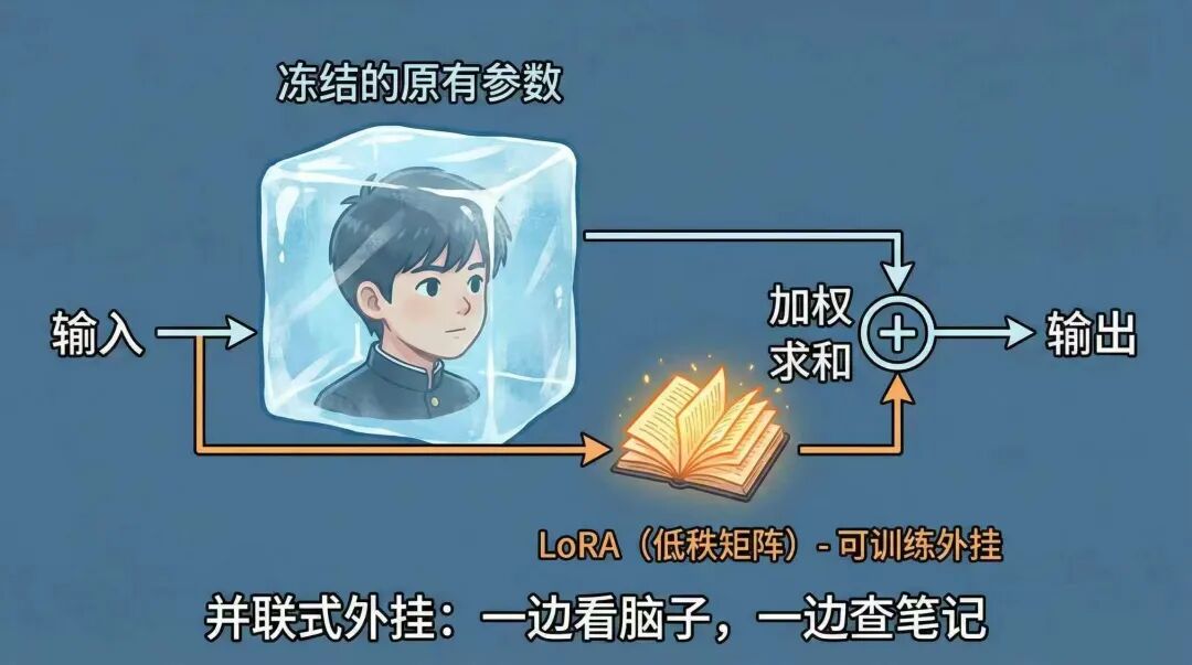 既然直接动大模型的原本参数极容易出现灾难性遗忘等问题,那我们给大模型接入一个增量外挂插件,只去调外挂插件里的内容,不就行了?