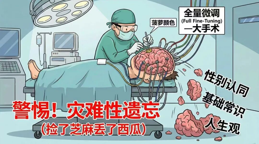 但这个过程由于是全量微调,学生在自主探索过程中,可能不仅是在学科知识这块进行知识的重建,对于自身的一些东西,比如人生观价值观等都会跟着进行重组。这就比较可怕了。。。比如学生可能只是为了要记住“菠萝是黄色的”,但竟然因此调参数把自己的性别搞反了。。。这个前面讲PPO的时候也提过,全量微调的方式更容易出现这种捡了芝麻丢了西瓜的问题。