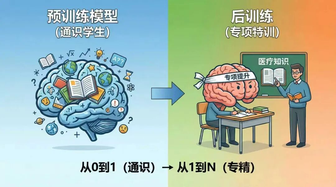 - 后训练:从1到N,通过调整预训练沉淀下的庞大参数,来让学生持续在某一方面专项突破加强。