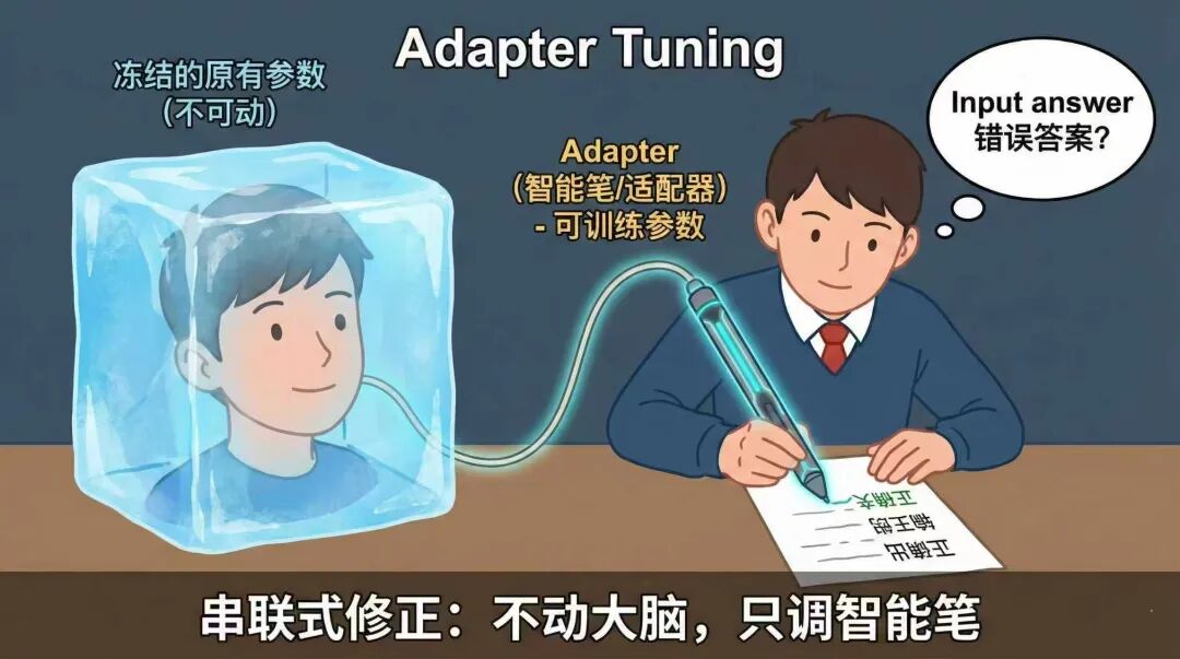 与刚才的全量微调,让学生重新学习相比,就好像给学生新发了一个智能笔,学生不需要去重新学习,这根笔会在学生下笔回答问题时,每一步都会经过智能笔的矫正思路。这样一方面即完成了对于业务微调的诉求,又能不动模型的原有参数。