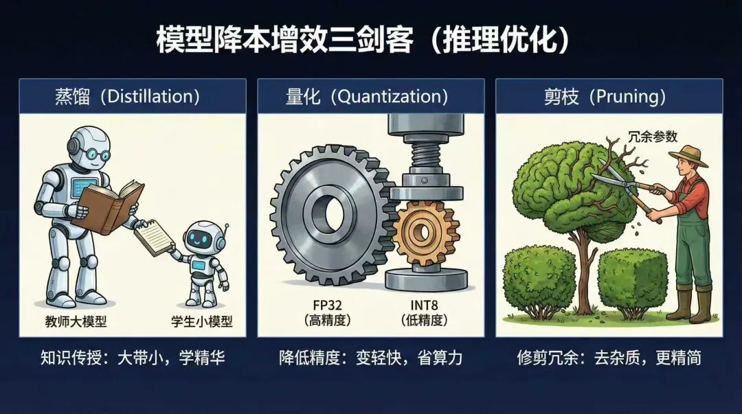 所以这里再简单展开介绍下大模型后训练,出于降本增效的三种方法:蒸馏、量化、和剪枝。首先大模型降本增效的目的,其实就是减少模型推理时的算力消耗。那么这三种方法,也都是围绕着这一目标进行的,只是各自侧重点不同。