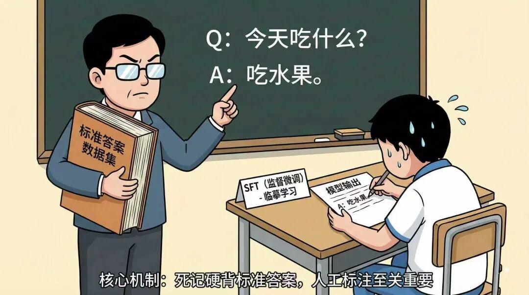 监督学习微调,则相当于老师给了学生一堆的题目和答案(标注数据),来让学生模仿答案的输出来进行学习。这个过程里,来自于人工整理的“标准答案”至关重要。人工整理出“输入问题”和“理想预期回复结果”的成对数据,模型通过学习这些成对数据,来不断调整并收敛参数,让自己输出的内容尽可能贴近“标准答案”。