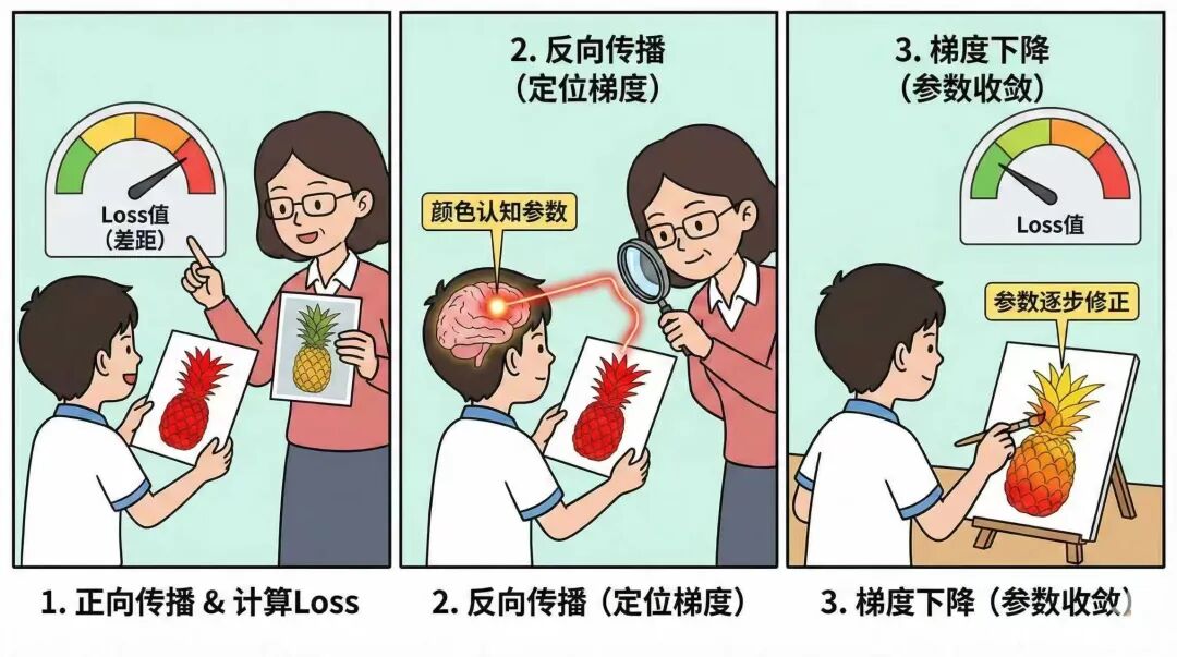 然后拿到分数差距后,老师会对照学生的错题点,逐一排查,推断学生在做题时的可能的知识误区和具体哪些知识没有掌握等。比如之前对于菠萝错误判断为了红色,那就判断学生其实对于菠萝的颜色理解的有问题。这个环节在模型训练中称为“反向传播”。对比“正向传播”,是根据输出时与预期的“loss值”,来反向推导模型在推理过程中,每个参数对于loss值的贡献度,也称之为梯度,来找到这些真正导致问题的参数。