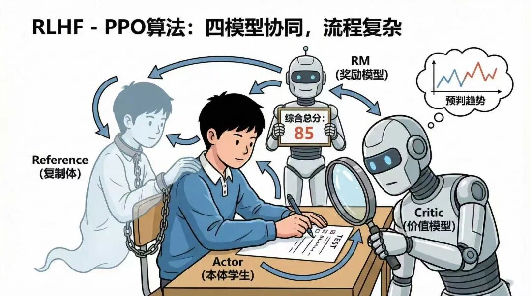 PPO的训练方式相当于通过打分让学生自己优化自己探索,但需要RM和Critic两位机器人老师来全程评估,并需要复制学生本体来作为参照,四个模型一起跑,又重又复杂。