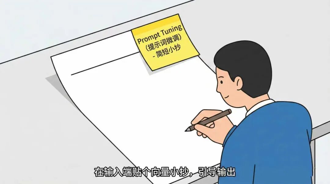 这里用学生答题来比喻的话,,则prompt tuning更像是一个简短的小抄,贴在卷子的最前方。学生在答题时,会先看一遍这个小抄再答题,以此帮助学生在答题时更加准确。