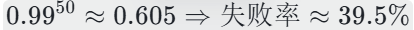 假设我们搭建了一个全自动化的 Agent 流程,共需要 50 个步骤完成任务。即使目前最先进的模型能做到单步准确率 99%(即幻觉率仅 1%),在连续 50 步无干预的情况下,最终结果的无错概率为: