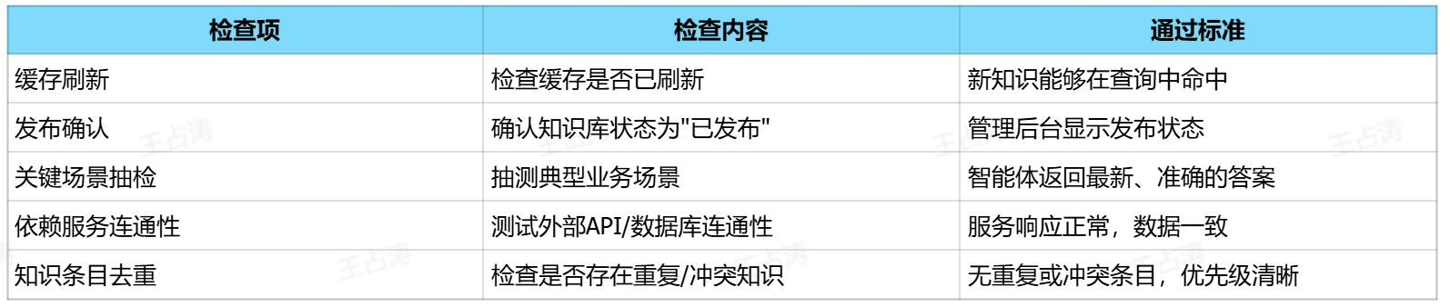 - 知识库层面:确认知识条目已成功入库,内容格式正确,索引状态正常