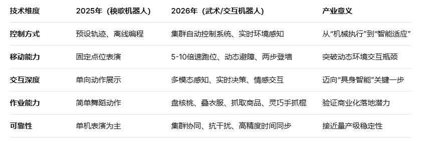 对比2025年与2026年春晚机器人技术参数,可以清晰看到具身智能技术的实质性突破