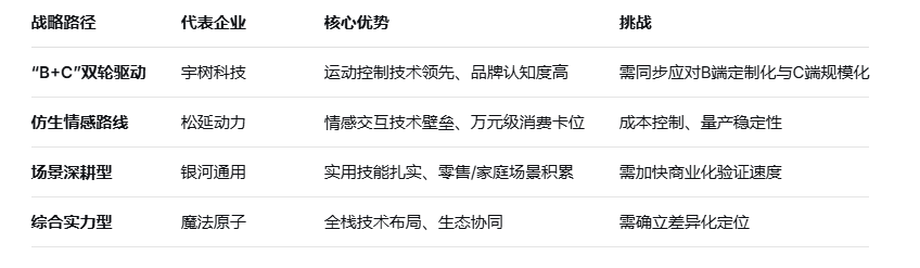 • 品牌心智占位:更为关键的是差异化定位的建立——银河通用强化“能干事”的实用形象(盘核桃、叠衣服、零售取货);宇树突出“表演中的技术极限”;松延卡位“消费级机器人”心智;魔法原子则展现综合实力。这种品牌区隔在未来的市场竞争中将产生持续的溢价效应。