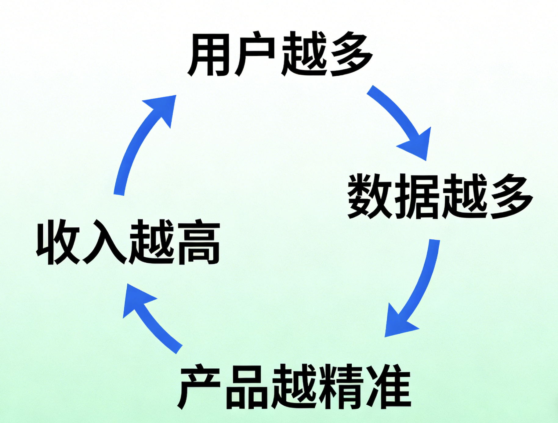 这其实是全球大厂一直以来的核心商业逻辑:用户越多,积累的数据就越多;数据越多,产品就越精准;产品越精准,收入自然越高;反过来,又能吸引更多用户加入。