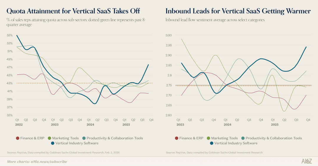 但市场数据却在讲一个完全不同的故事。最近的数据显示,上市的垂直 SaaS 公司销售表现异常强劲:销售配额完成率和入站潜在客户情绪都大幅改善,现在已经领先于所有其他企业软件类别,包括财务与 ERP、营销和生产力工具。有人开玩笑说,如果垂直软件真的死了,那可千万别告诉那些销售代表,因为他们正在创造有史以来最好的业绩。至少现在看来,对行业工作流程的专业化理解仍然非常重要。