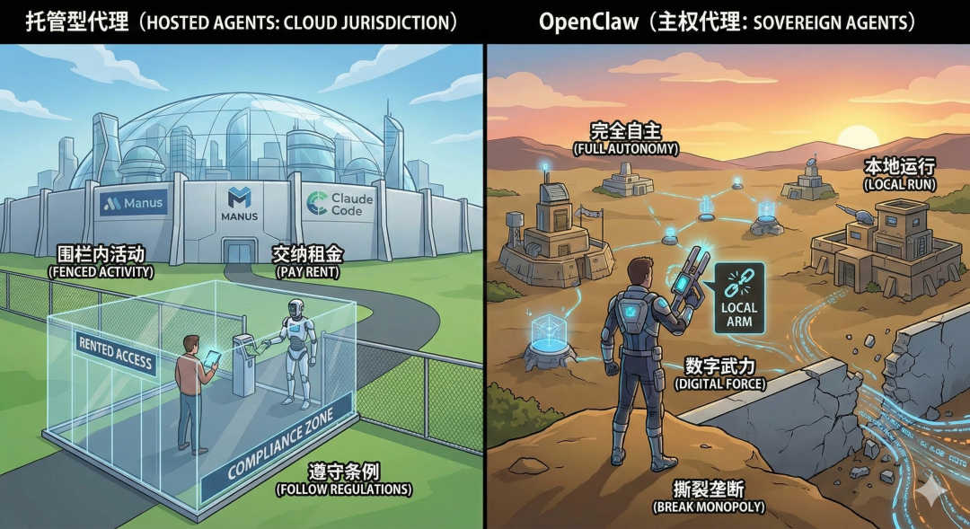 - 托管型代理 (Manus / Claude Code):它们是“管辖区”内的繁荣。你必须在服务商划定的围栏内活动,交纳租金(订阅费),并遵守他们的治安条例(过滤与护栏)。很明显,这时候决策模式和决策权是在托管方的,用户就等个结果。