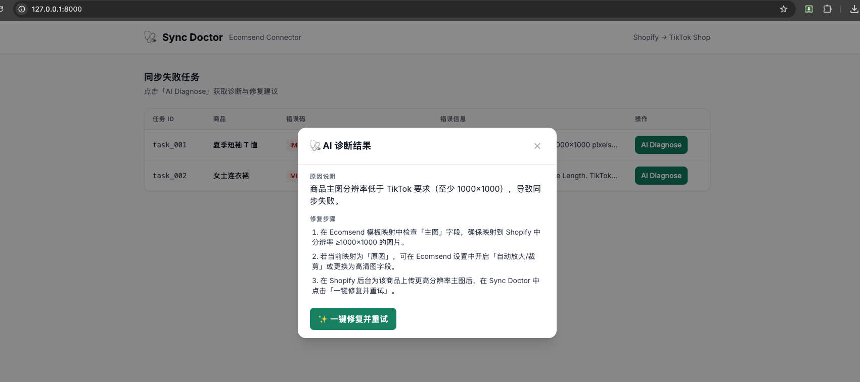 在“同步日志”列表页,每条失败记录后面加了一个AI Diagnose按钮。用户点击后,弹窗显示诊断报告。