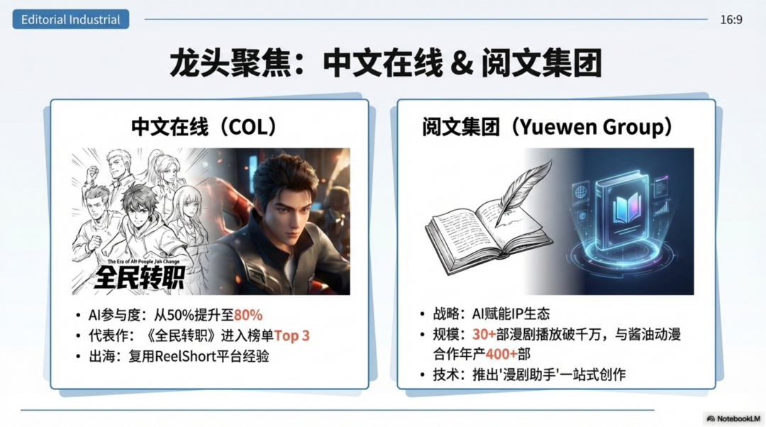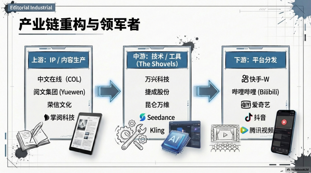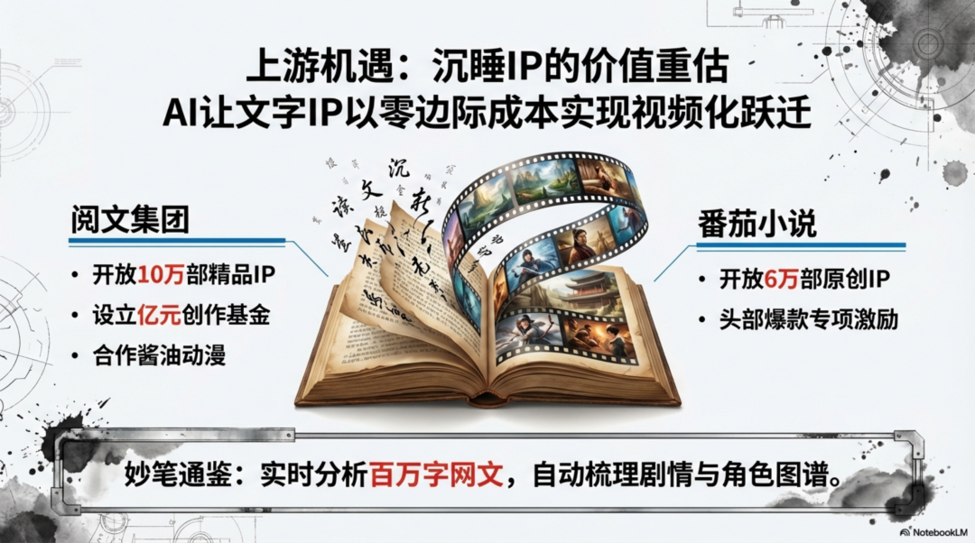 AI让文字IP以零边际成本实现视频化跃迁。阅文集团开放了10万部精品IP,番茄小说紧随其后开放了6万部原创作品,并设立亿元创作基金支持改编。