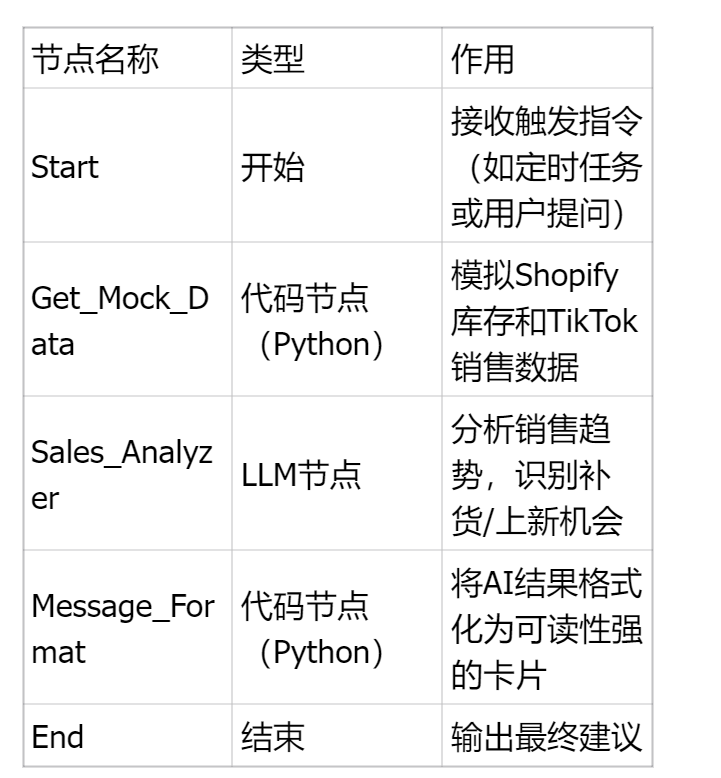 用户每天看着同步过来的销售数据,却还要自己手动分析哪些商品该补货、哪些新品该上架。数据就在那里,但决策依然滞后。于是我尝试用Coze搭建了一个“智能补货/上新提醒”的Agent,让Connector从一个被动的同步工具,变成了主动出谋划策的增长助手。