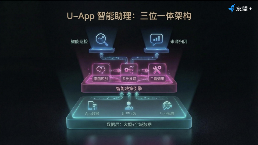而现在,我们做了U-App智能助理,架构很简单:数据 + 推理引擎 + 意图理解,将全域数据标准化,搭建了推理引擎、调研工具引擎与意图分析引擎,让 Agent 能完成智能巡检、根因归因、机会挖掘、智能决策的全流程工作:不仅能自动监测数据异常,还能快速定位问题根源,甚至能结合行业数据对比,找到用户沉默、转化率波动的核心原因,并给出具体的解决方案。