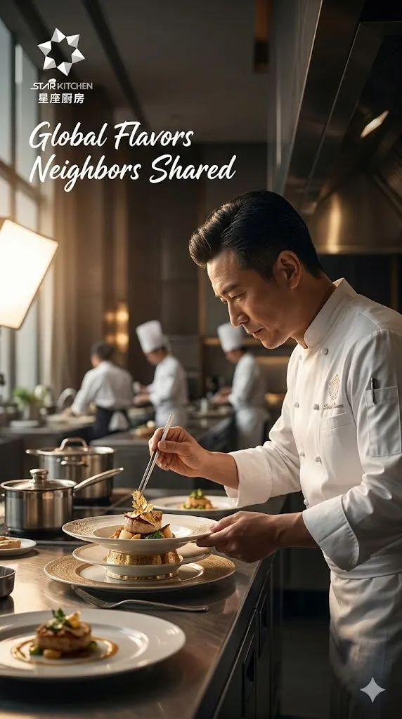 模拟小白随便说话:给我一张封面图,图片2-3是风格上的参考,我是一家团餐公司,背景是高级餐饮,五星级大厨等等,有主体,参考竖屏(9:16)企业宣传片风格数字摄影,电影感,传递出梦想、利他的,高完成度商业宣传片质感。前面logo用第一张图片的去色白色,高级感,文字用英文,少一点,字小一点,不要投影,手写艺术字(参考图3),“环球美味,邻里共享”