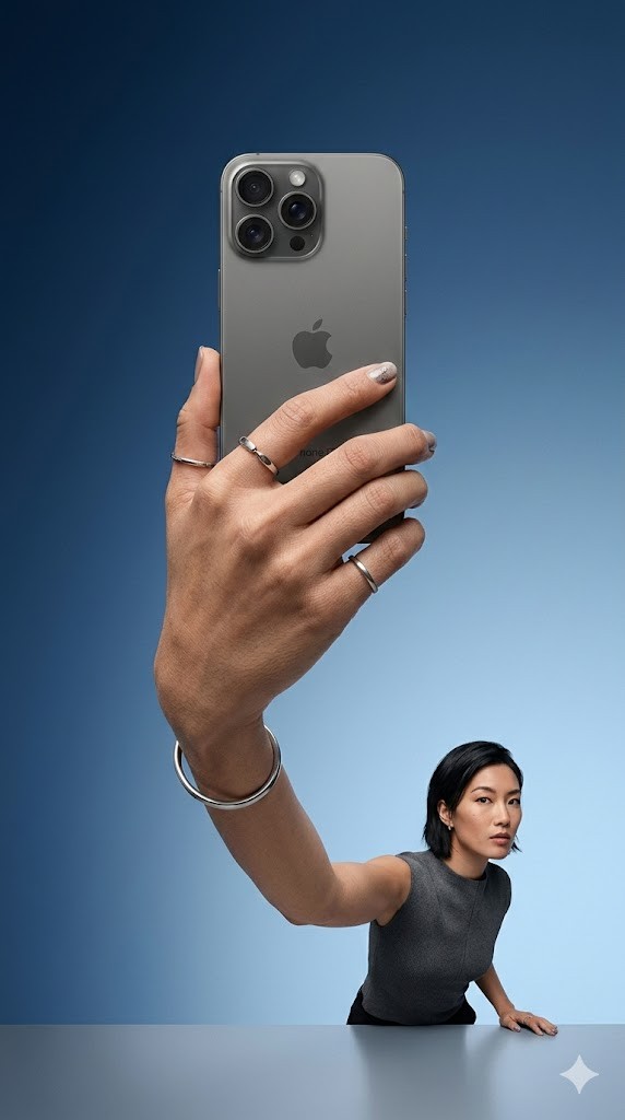 单次生成效果:iphone17,创意超现实摄影作品,低角度仰拍视角,人物手臂夸张前伸,形成强烈的视觉错位效果;背景为纯净渐变单色,光线柔和均匀,整体呈现出极具张力的透视感与现代艺术氛围;画面质感细腻、细节清晰,构图大胆前卫,充满超现实的视觉冲击力,兼具专业商业摄影的精致质感与干净统一的色彩层次。
