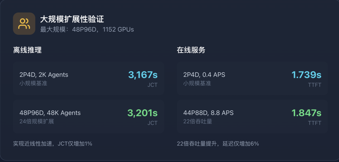 从2P4D(2K agents)扩展到48P96D(48K agents),实现了近线性加速(JCT 3,167s vs. 3,201s)。在线服务配置下,44P88D实现了22倍吞吐量(8.8 vs. 0.4 APS),同时保持相似的延迟。