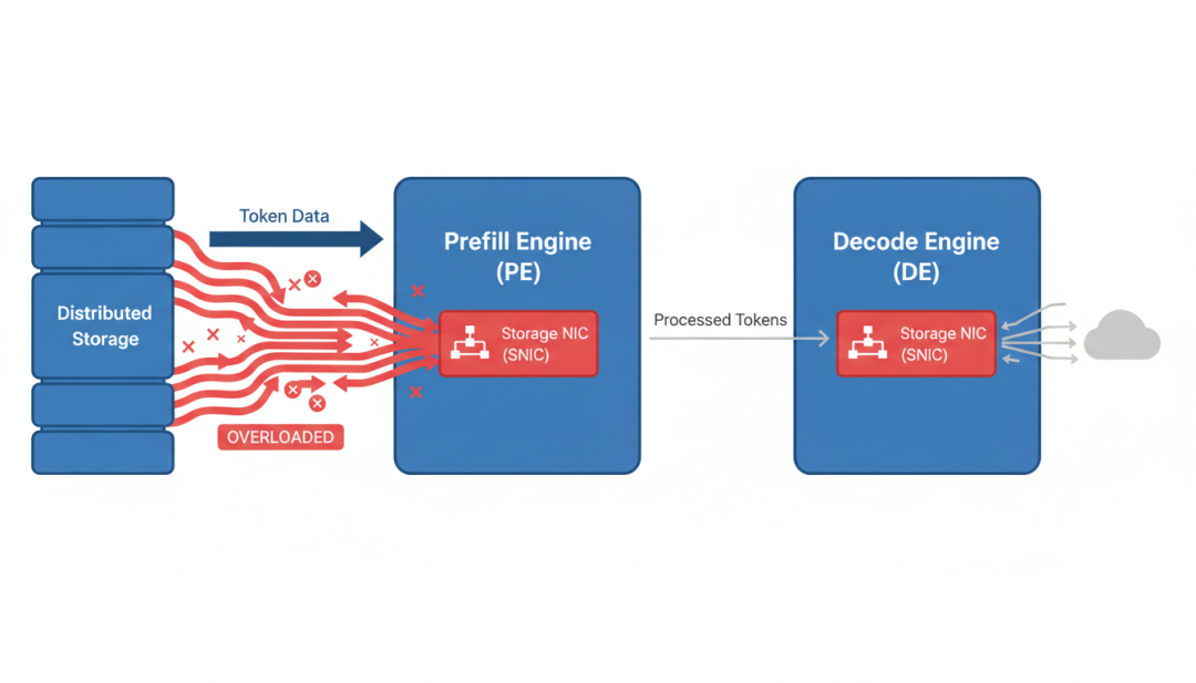 但这里有个问题:预填充引擎的存储网卡(SNIC)带宽有限,通常是400 Gbps。当大量请求进来时,这个网卡很快就饱和了。