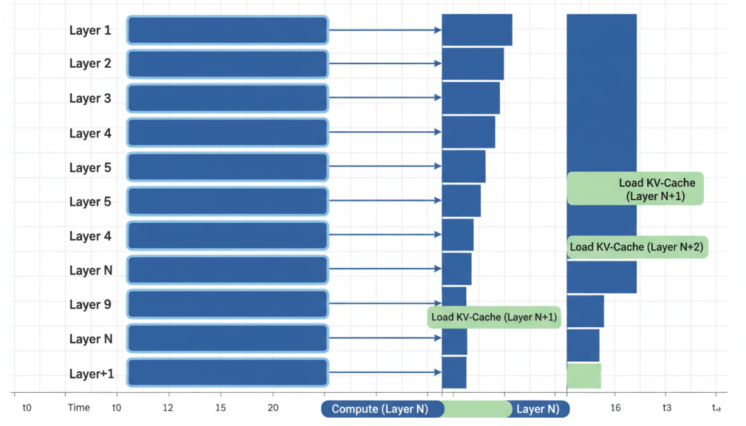 解法:层式传输——KV-Cache是按层组织的。DualPath采用层式传输,把计算和数据传输重叠起来:计算第N层的时候,同时加载第N+1层的KV-Cache。