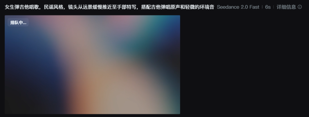 我做了一个简单的测试:输入文本“女生弹吉他唱歌,民谣风格,镜头从远景缓慢推近至手部特写,搭配吉他弹唱原声和轻微的环境音”,同时上传了一张女生弹吉他的参考图和一段民谣吉他音频。