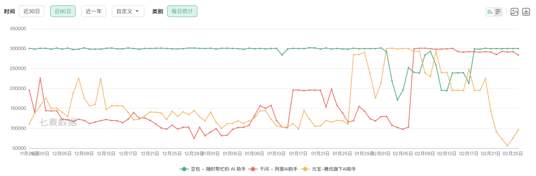 如果对数据进行更深入分析,就会发现这次春节红包大战还是存在差异的。我们对比了一下元宝、千问、豆包过去三月在七麦数据上的下载量预估,可以得出这样一张图: