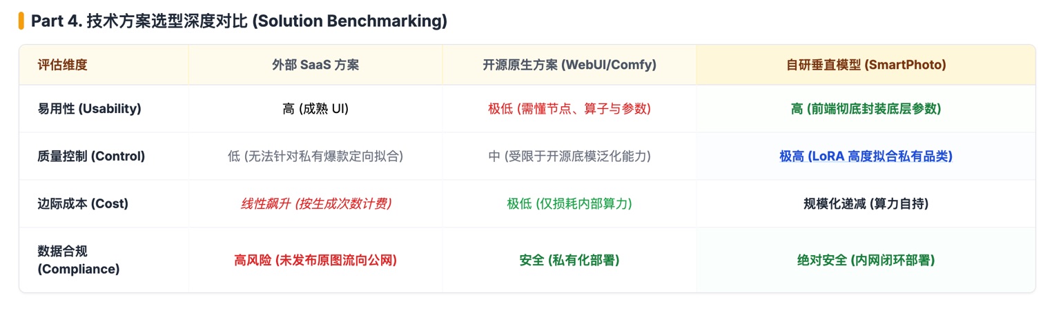 面对上述痛点,管理层曾提出直接采购外部 SaaS(如 Photoroom)。为此,我们建立了一个涵盖“SaaS、开源原生、自研私有化”的 3D 决策矩阵进行对抗推演: