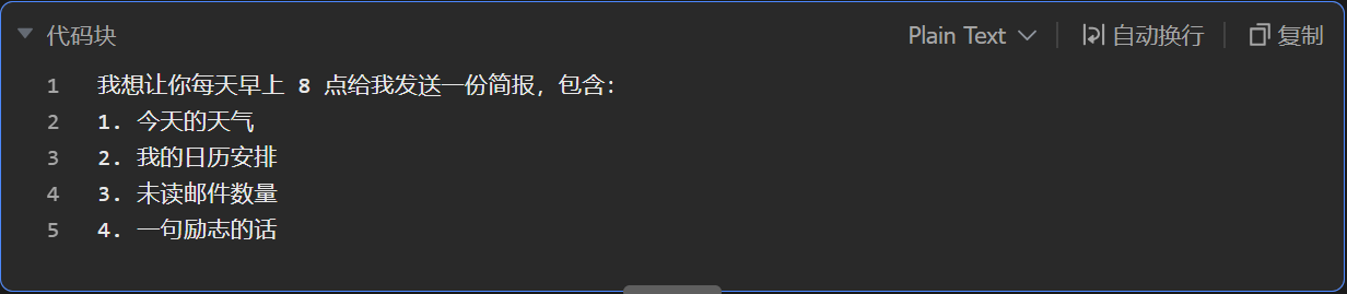 - 每日简报:每天早上发送天气和日程