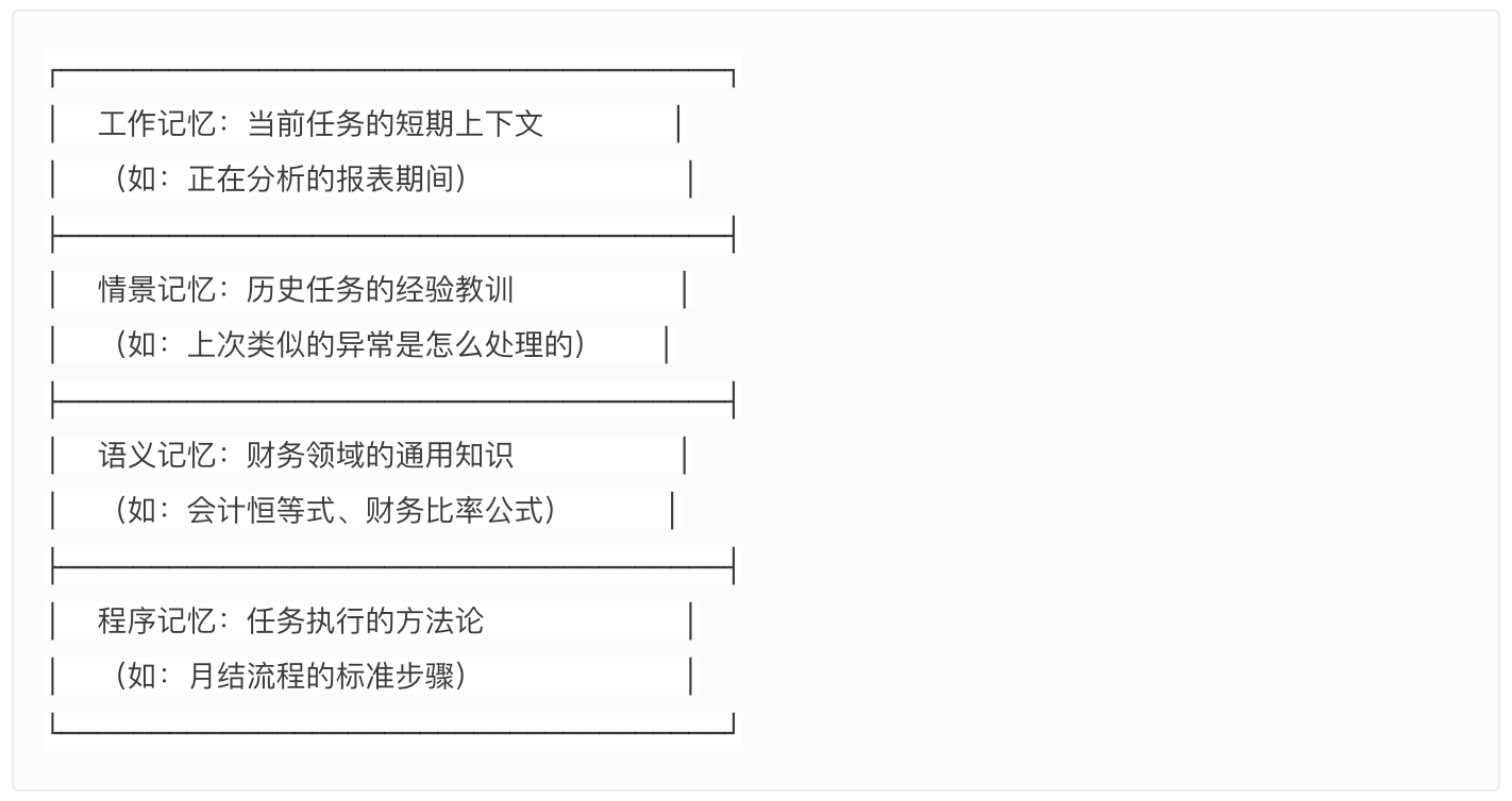 一个专业的财务AI Agent需要四层记忆: