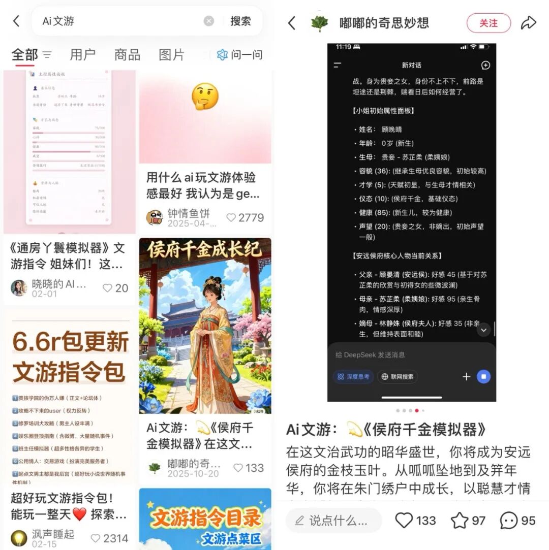 AI文游的商机最早还是由网友发现,疑似是从“人设指令”生意发展而来,因而销售渠道和前者一样,是在小红书、闲鱼等平台传播。买方将文档内容复制到任何一个大模型即可游玩。因为创作者不承担其他成本,所以“文游指令”定价较低,九块九通常就能获得一个包含“宫斗模拟器”“恋综模拟器”“末日生存模拟器”在内的大合集。