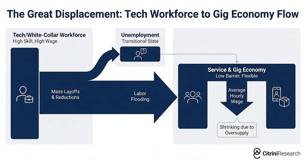 - 消费购买力的结构性受损:这些失去高薪工作的中产阶级面临终身收入预期的结构性受损。尽管部分人可能向下兼容寻找低薪工作,但整体而言,他们在被迫削减可选消费、延缓大宗商品购买,并严格控制日常开支。