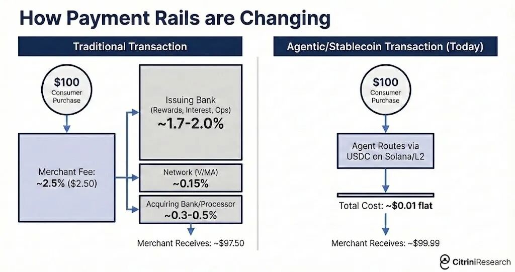 报告假设,在进入由AI智能体主导的机器对机器(M2M)商业生态后,这2%-3%的摩擦成本迅速成为了优化算法的首要打击目标。AI代理无需物理信用卡,它们通过编程,直接在去中心化的网络中寻找最快、最廉价的支付路由。最终,海量的微小交易被迅速迁移至基于Solana公链或以太坊二层网络(Ethereum L2s)的稳定币结算体系中。在这些区块链网络上,结算几乎是瞬间完成的,而单笔交易成本仅以几分之一美分来计算,实现了真正的支付摩擦归零。