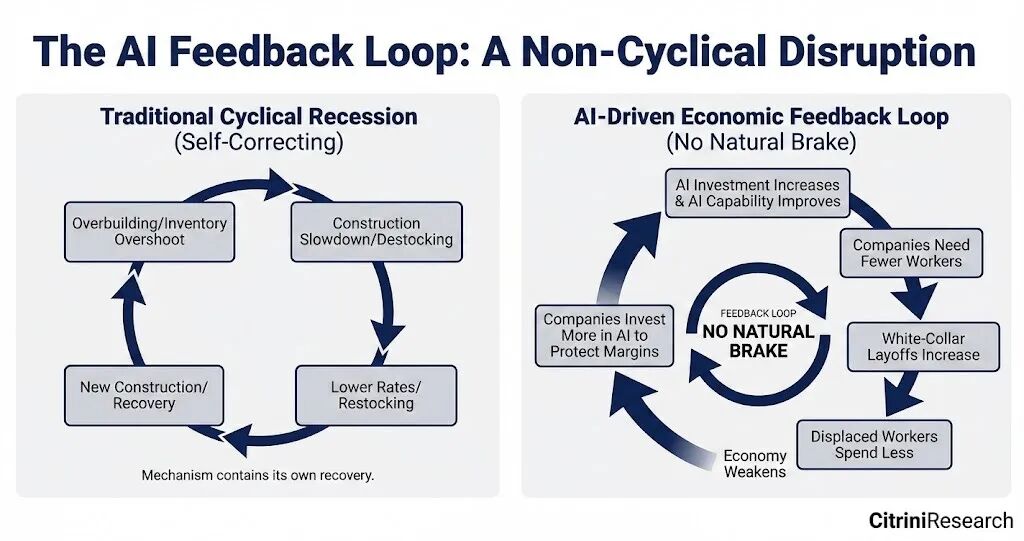这种衰退并非传统意义上的周期性经济衰退。传统的商业周期衰退通常由过度建设(Overbuilding)、库存超调(Inventory Overshoot)或央行激进紧缩引发,随后通过去库存、央行降息释放流动性,最终实现经济复苏(Restocking & Recovery)。然而,Citrini所描绘的危机是一种由技术进步绝对替代效应引发的“结构性通缩螺旋”。当极度充裕的机器智能摧毁了支撑整体经济消费需求的人类劳动收入基座时,建立在旧有范式上的任何宏观调控工具都将宣告失灵。