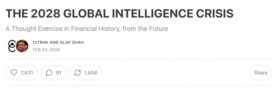 引发这场史无前例的恐慌性抛售的,并非实体经济基本面的骤然恶化,也非美联储超预期的货币紧缩政策或地缘政治的黑天鹅事件,而是一篇在金融圈及Substack等自媒体平台上迅速病毒式传播、累计获得超2200万次阅读的宏观推演备忘录——《2028全球智能危机》(The 2028 Global Intelligence Crisis)。