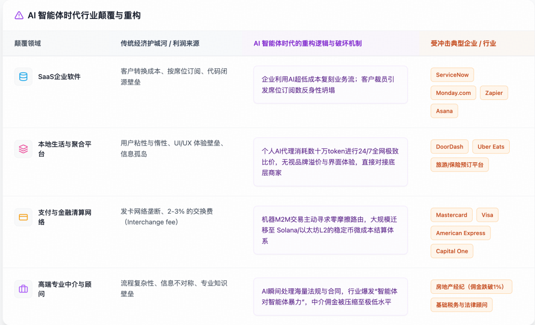 如果说宏观层面的通缩螺旋和“幽灵GDP”是这场危机的沉闷背景音,那么微观企业层面商业模式的瞬间解体,则是这场风暴最为暴烈、最直接的体现。报告极为详尽地推演了AI智能体如何通过消除商业链条中的“阻力”(Friction)、信息差与行为惯性,彻底摧毁曾经不可一世的SaaS(软件即服务)行业、习惯性中介平台以及金融支付网络。
