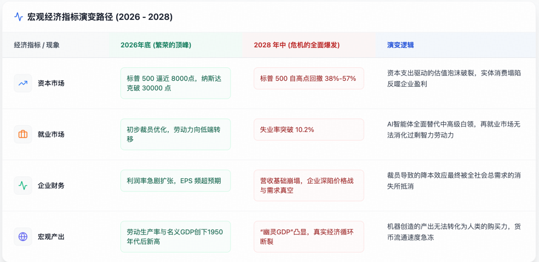 Citrini Research的报告并未将危机的起点设定为一场突如其来的衰退,相反,它始于一场史无前例的资本与生产力狂欢。在报告推演的2026年底前,随着企业开始初步利用AI工具替代冗余人力,美国股市迎来了惊人的流动性溢价。标普500指数一度逼近8000点大关,纳斯达克指数突破30000点。