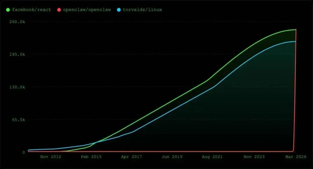 2026 年 3 月,开源圈迎来历史性一刻:诞生仅四个月的 OpenClaw,GitHub 星标数突破 25 万,正式超越 Linux(约 20.8 万星)与 React(约 24.3 万星),登顶非聚合类软件项目星标榜首。这一成绩堪称颠覆 ——React 用 13 年积累才达到 24 万星标,Linux 作为开源基石历经数十年发展,星标增长已进入平缓期,而 OpenClaw 以 “垂直飙升” 的态势,创造了 GitHub 星标增长的新纪录。