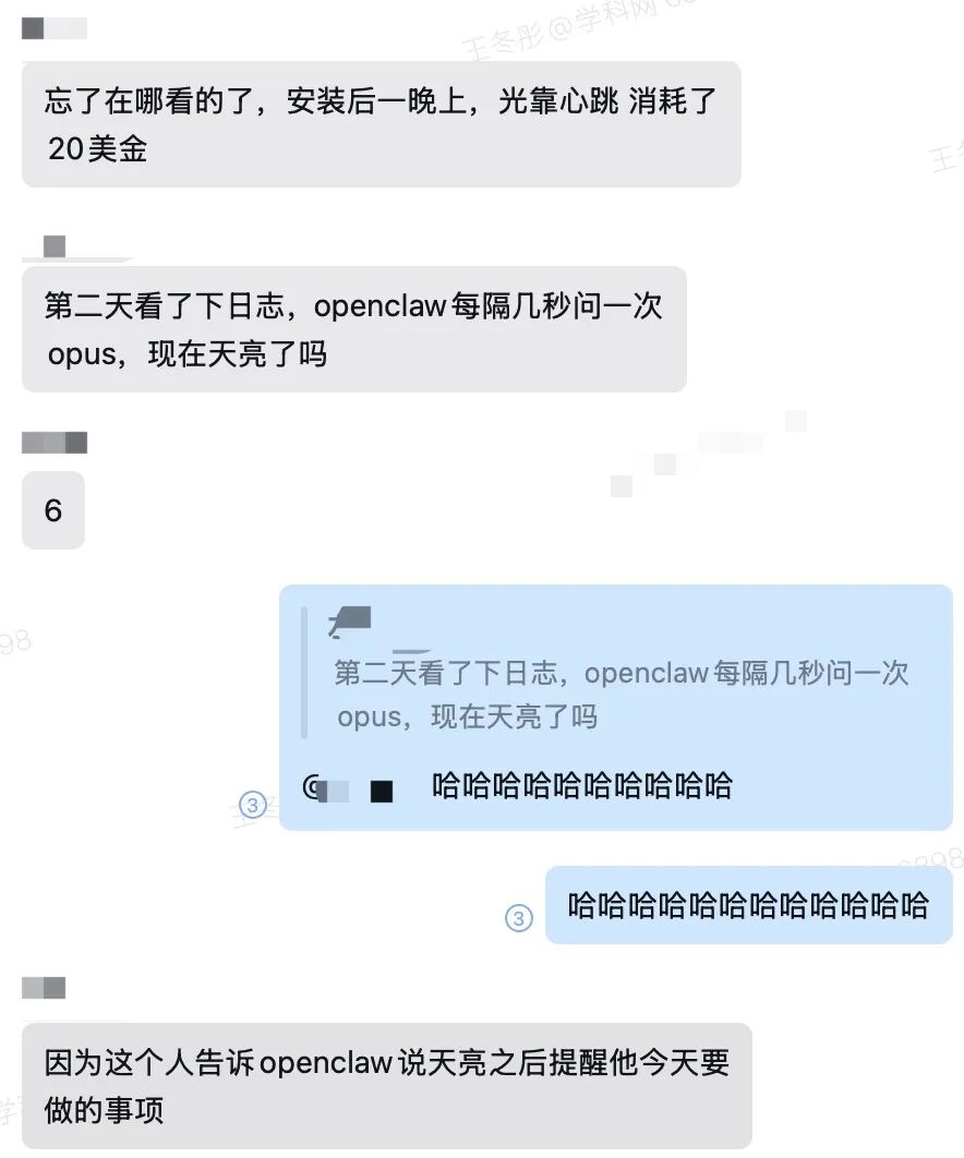 - 心跳账单:有用户安装后,一晚上什么都没干,光靠OpenClaw的“心跳检测”,就消耗了20美金。第二天看日志才发现,它每隔几秒就问一次Opus:“现在天亮了吗?”因为用户之前告诉它,天亮之后提醒他今天要做的事。好家伙,这AI是怕自己睡过头,还是怕用户睡过头?