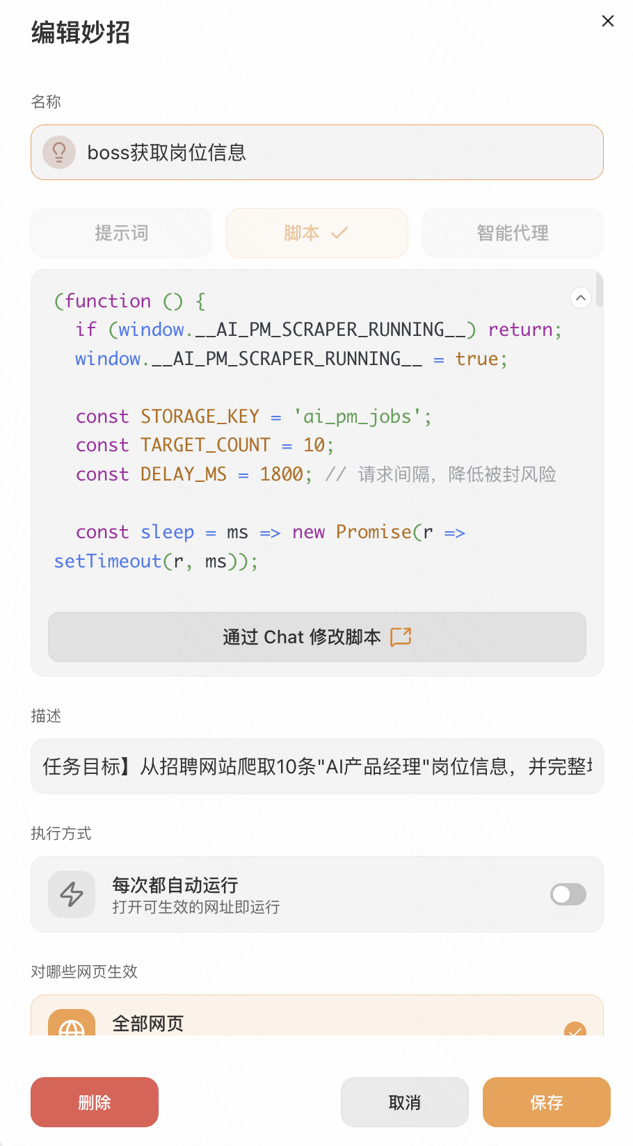 智能代理、妙招、脚本,这三个能力都指向一个方向:让浏览器能”自己干活”。