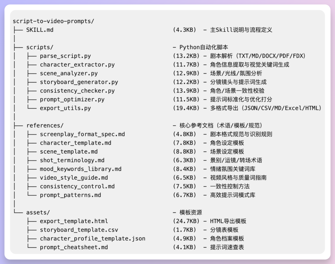 重要的部分可以单独拎出来补充单独文档和脚本,比如我对视频提示词有指定的要求,那么可以单独一个提示词参考文档(放在 references )或提示词格式参考模板(放在 assets )并要求脚本在指定场景调用。